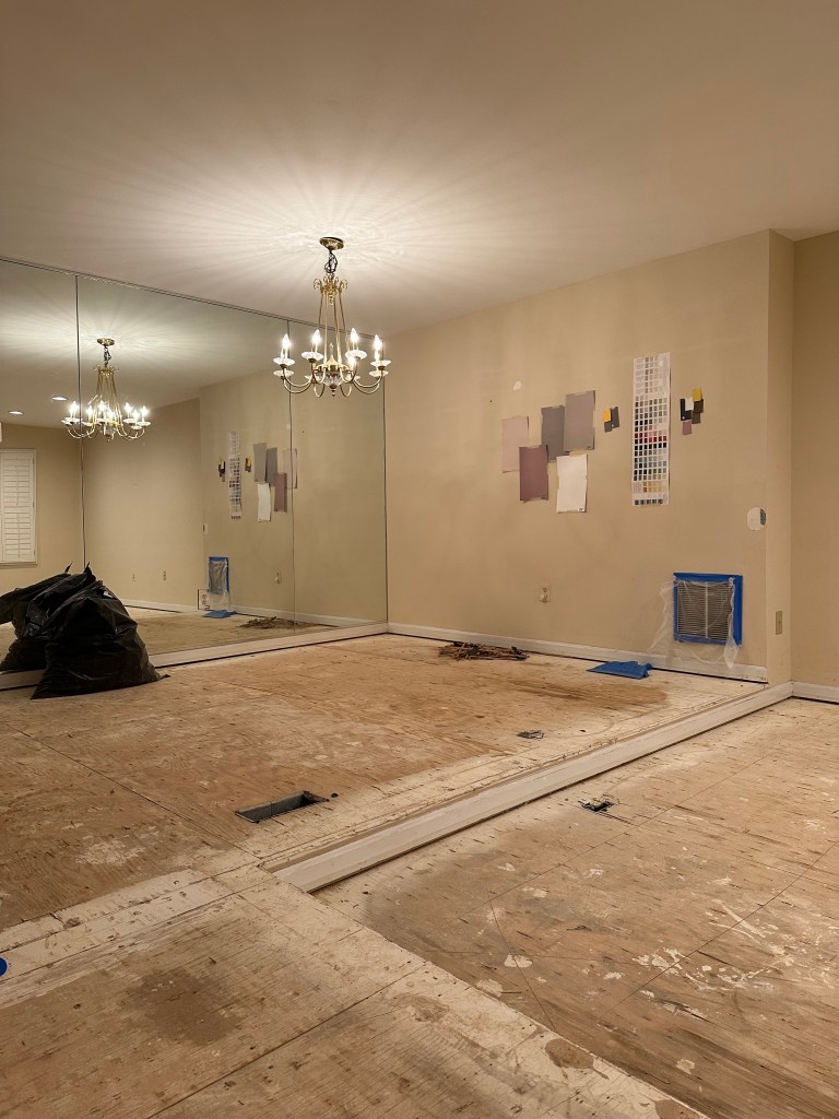 After that, switch out the chandelier, paint the walls and ceiling, and remove the giant mirrors – or keep them and use the dining room as a ballet studio? No, remove them.