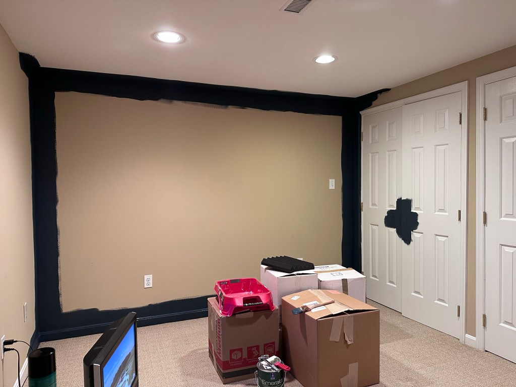 Looking at dark paint options, I decided to go super dark navy. The whole house is being repainted in very flat-finish paint, so that will work especially well in the theater. And since I love how the primary bedroom turned out so much, I wanted to colorwash the walls, ceiling, doors, and trim in this room as well.