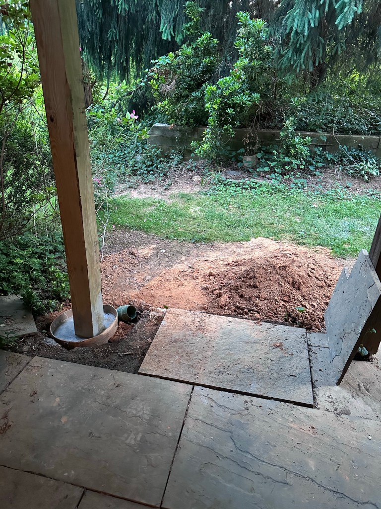 Second problem first – early-on, my contractor and his crew came in with a new deck footer and post on the left, since the old one was starting to get squishy and rotten. I didn’t help too much with that other than by expertly jumping around on the deck afterwards to see if it was still wobbly –