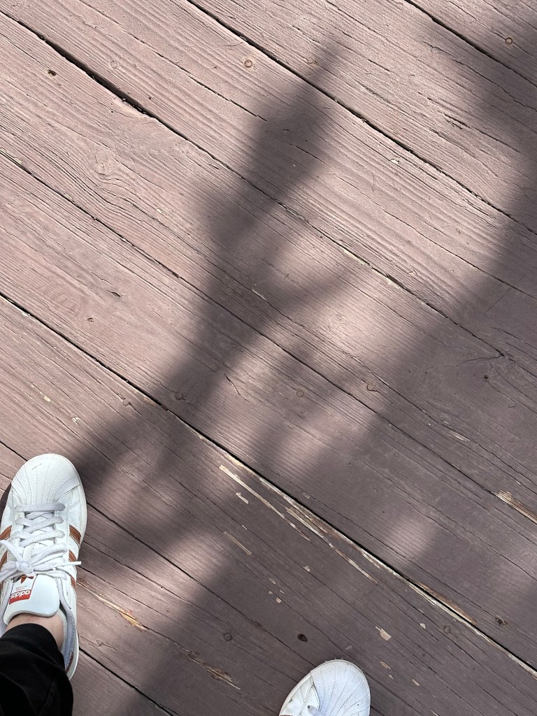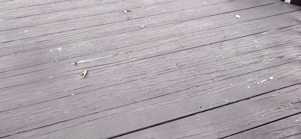 Firstly, it’s super weathered, some of the deck boards and rail posts are loose or popping up, and there’s some minor splitting throughout: