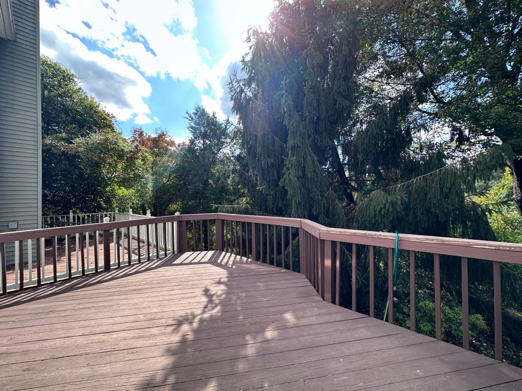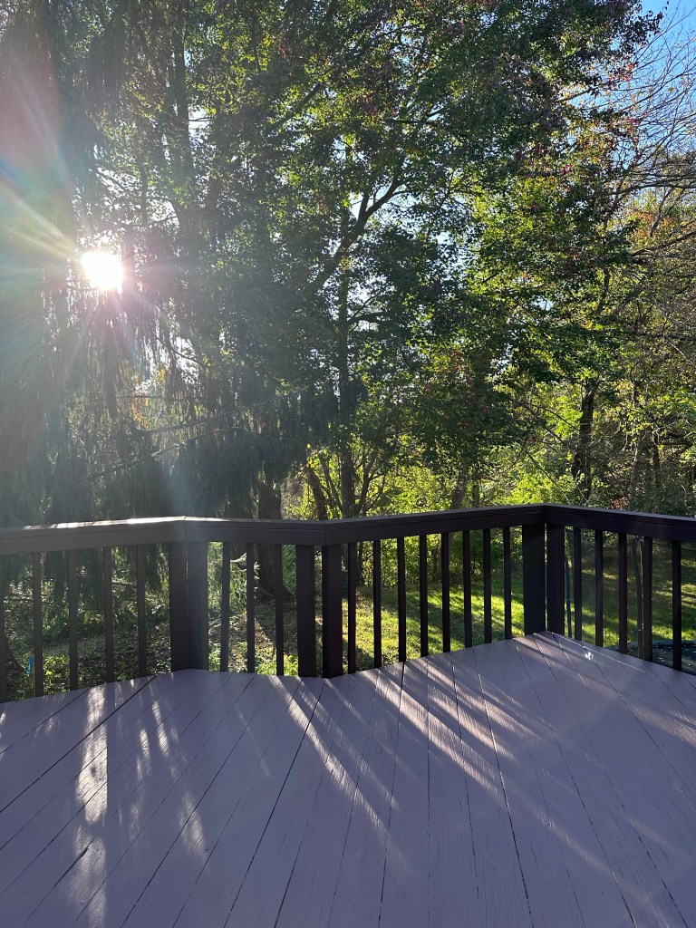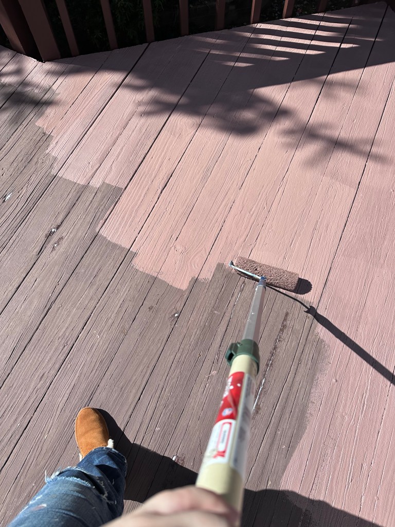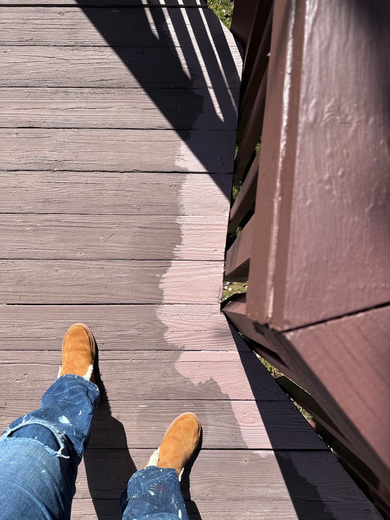My deck had already been painted at least twice in solid colors, but I was inspired by my left-side neighbor’s deck, which is a dark brown deck with white railings, so I decided to contrast with that and do a lighter deck (also good for not burning your feet) with a dark railing.